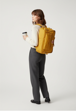 Model wearing yellow Fjällräven Kånken as backpack and shoulder bag