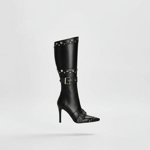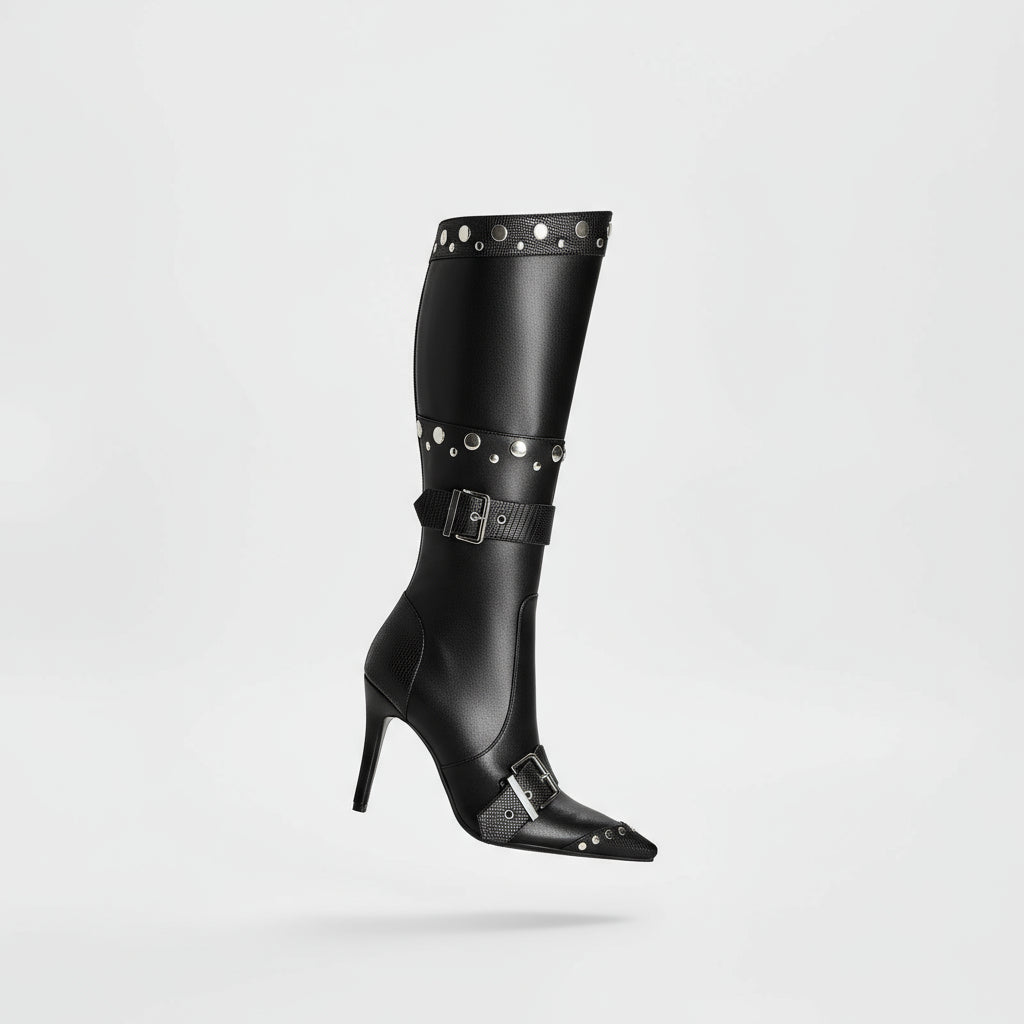 Wrapped in sleek black faux leather and finished with silver studs and bold buckles, these boots redefine versatility. With the detachable foldover, enjoy wearing them in two different ways — as chic ankle boots or as bold knee-high statement boots.